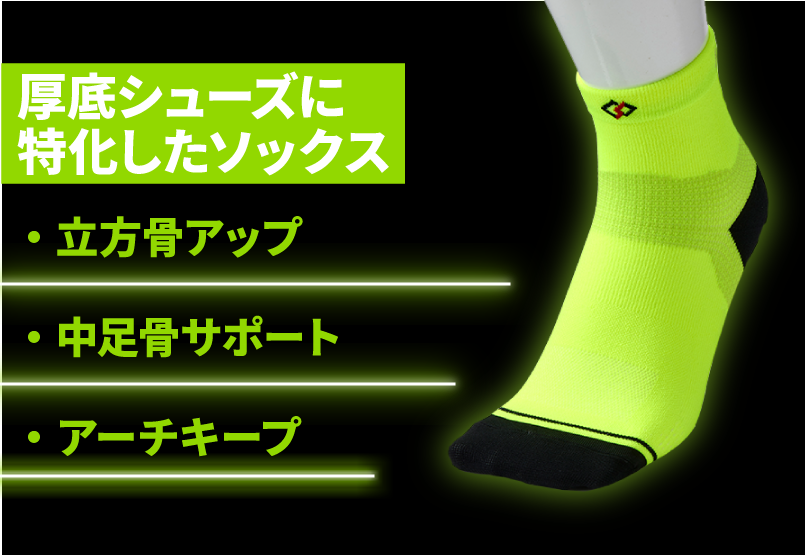 厚底専用ソックスと打ち出したコラントッテの自信作!中足骨・立方骨をしっかり支えて、厚底の反発に堪えよう。