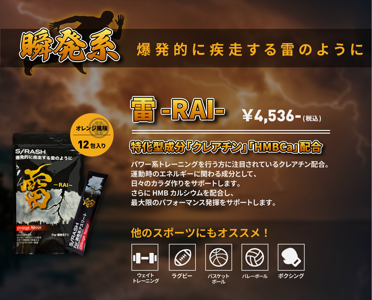 シーズンも開幕し、1日1日の質を向上していく時期です。 本番に向けたカラダ作りと最終調整をSRASHと共に! 今回はパフォーマンス向上にお勧めの必須アミノ酸(EAA)を4,000mg配合したサプリメントを種目別にご紹介します!