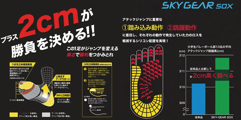| 特性 | ジャンプ性能 | グリップ性能 | V-FIT構造 | 抗菌防臭機能 | 2枚組 |